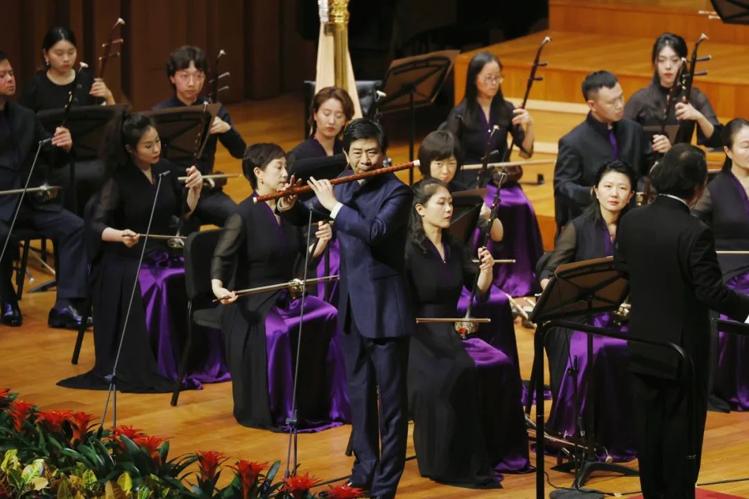 吴樟华教授带来的排笛与乐队《腾飞》由作曲家朱晓谷创作于2018年,乐曲以活泼明快,热情洋溢的气氛渲染,以乐而贺,松庭流芳,恰如作品中所呈现的钱江潮水奔腾不息。