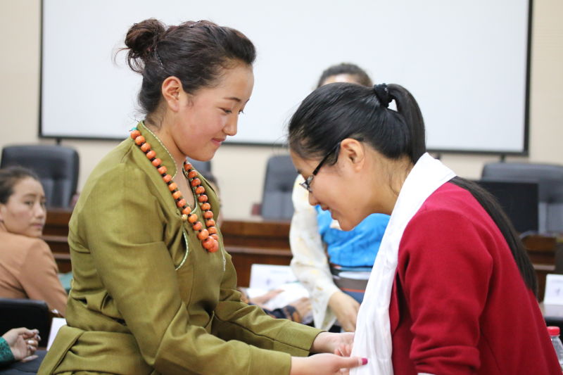 开班仪式结束后,陈毅老师给我介绍了西藏班助教老师才旺玉珍,大家都叫她阿珍。她是那曲地区文化局群文科主任科员,专门负责学员们的学习生活,并且会讲汉语。从那时起,她就成了我和西藏班学员沟通的桥梁。陪着他们参观完校园后,王美华老师告诉阿珍,我是宣教处派来做宣传的,反复说了好几遍,阿珍终于弄明白我是来干嘛的了。我走上前去跟她交流,她立马叫了几个学员,教他们该怎么回答我的问题。在她的安排下,拉巴卓玛用有些生硬的汉语回答了我的问题。我还在思索着该怎么为这语言上的尴尬收尾时,阿珍对拉巴卓玛说“快给老师献条哈达……”我误打误撞地成了他们眼中的“老师”。正惊讶时,卓玛已经把哈达挂到了我的脖子上,我第一次感受到藏族人民的热情,见到了我心中神圣的哈达。