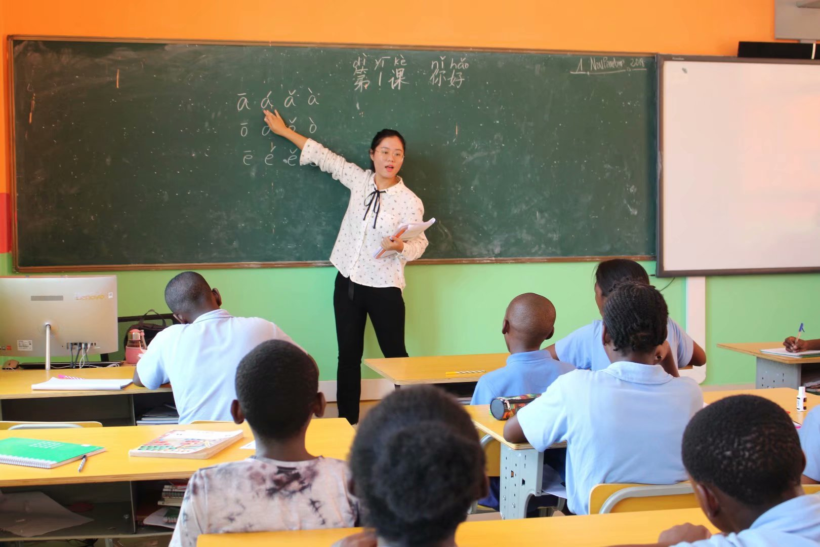 非洲的教学条件十分简陋。没有教具我就自己做,没有汉语听力材料我就自己录制,没有作业本我就自己画格子手写题目……很多在国内不是问题的问题,在那儿我都要一一解决。起初,我使劲教,可效果甚微。后来,我改变教学思路,和学生一起吃当地的食物,和他们一起玩,一起聊天。我逐渐从他们眼中的外国人成为他们亲爱的伙伴。他们会在下课后跑到教师休息室给我编辫子,也会有学生邀请我去家里参加生日聚会,在我带病上课讲不出话来的时候,学生叮嘱我赶紧坐下休息……