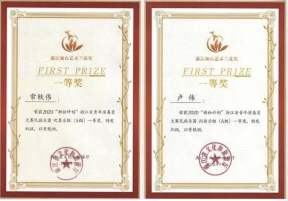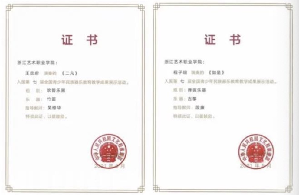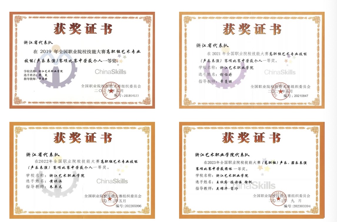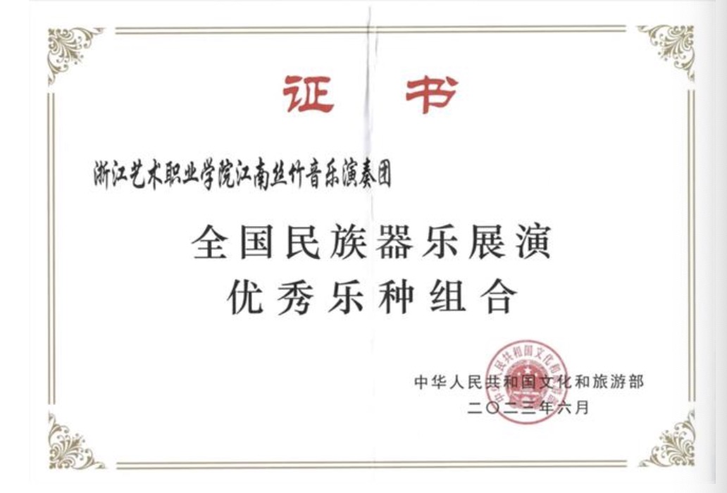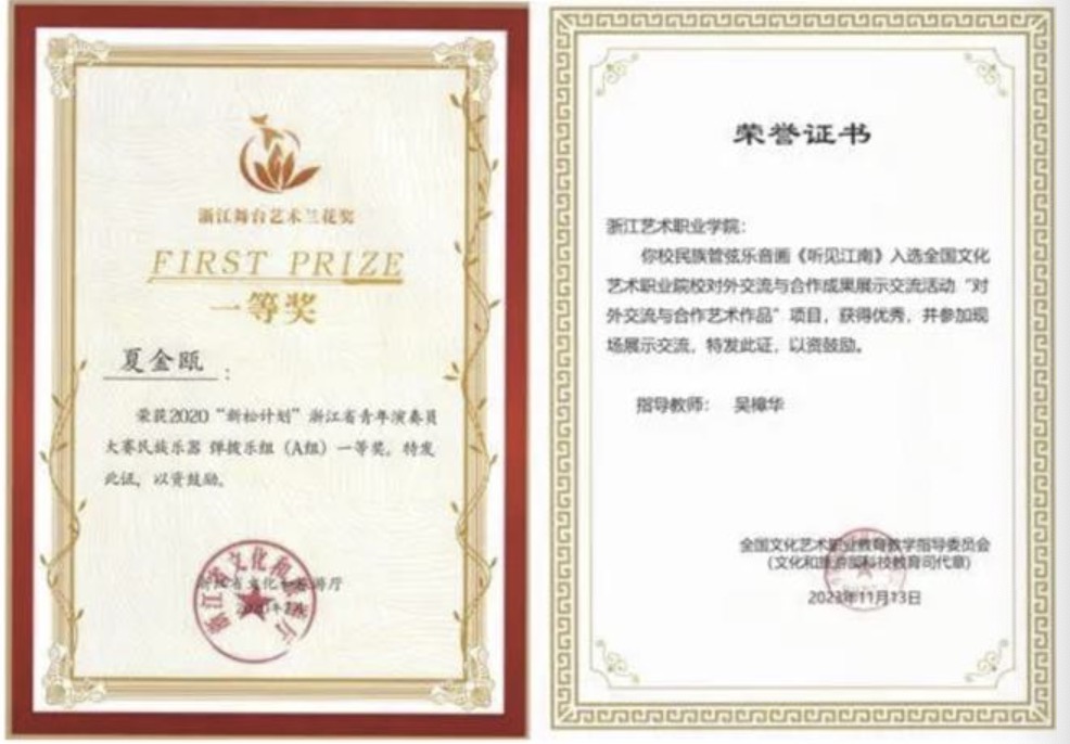 荣获国家级奖14项、省部级奖109项。摘得“浙江音乐奖”,“江南丝竹音乐演奏团”入选文旅部全国民族器乐展演最高奖,《听见江南》入选全国文化艺术职业院校对外交流与合作成果展示优秀项目。在全国青少年民族器乐教育教学成果展示、戏曲教育教学成果展演、全国职业院校技能大赛中连获最高奖。